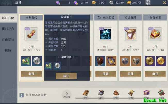 (5)同业委托 难度系数:★★★★☆ 推荐指数:★★★☆☆ 开启条件:冒险家等级到达10级 领取入口: 我们可以在游戏页面的右上角打开“活动”界面,完成活动后即可领取。