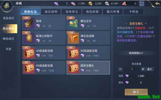 在商场充值购买也是一种快速获得各种资源的方法。其中,地中海藏宝图可以在钻石商店中通过购买国家宝藏礼获得。国家宝藏礼包的价格为1380钻,每周限购1个,使用后可获得4个国家宝藏奖券、10个地中海藏宝图以及三张不同的紫色藏宝图,我们可以根据自身情况酌情购买。