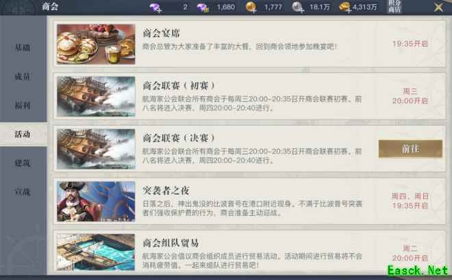 2.限时活动 《黎明之海》游戏每周都会开启各种限时活动,这些活动大部分门槛较低且奖励丰厚。如果玩家还处于冲等级提升阶段,那么毫无疑问推荐大家全部完成。但尽数完成对于一些玩家来说还是有一些门槛的,这边给一些玩法推荐: (1)商会活动 难度系数:★★☆☆☆ 推荐指数:★★★★★ 商会每日都会开启大量活动,如运宝船、皇家竞答和商会答题。周一、周二、周三、周四及周末还会额外开启商会宴席、商会组队贸易、商会联赛、突袭者之夜及商会投资战活动。 参与活动后可以获得银币、商会贡献度、船只技能、命运石碎片、战斗图纸等丰厚奖励,若是商会在活动中取得了名次,还可以额外赢取拍卖奖励并获得绑钻分红。 建议尽可能多参与商会活动,即便没有成功,也可以获得部分奖励。