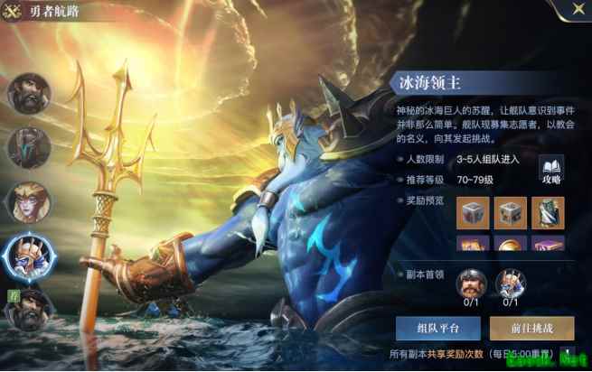 (3)勇闯寒冰岛、七海会武 难度系数:★★★★☆ 推荐指数:★★★☆☆ 勇闯寒冰岛、七海会武均为限时开启的组队活动,参加活动可以获得大量竞技币、魂石、改造图纸及船装。 其中七海会武为组队竞技活动,每周六20:00至20:30开启,建议都前往挑战,因为即便失败了也能获得大量竞技币与部分奖励。 勇闯寒冰岛则是组队秘境挑战活动,开启时间为每周一、周五的20:00至20:30,难度也较低的副本也能获取大量货币,推荐每周前往挑战。