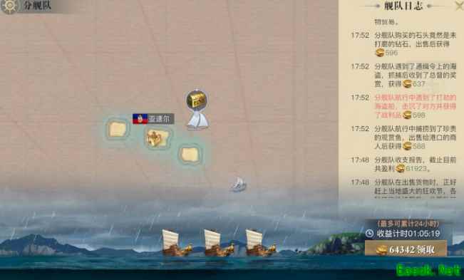 3.贸易 (1)分支舰队、贸易委派 难度系数:★☆☆☆☆ 推荐指数:★★★★★ 启航后的分舰队处于自动贸易状态,每半小时汇报一次收益结算,最多可积累24小时的挂机收益,超过24小时后的挂机收益将不再计入,建议每天及时领取贸易,刷新分舰队出海。