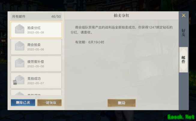 4.如何获取拍卖分红 商会通过参与活动赢得的拍品,在商会拍卖中拍出后,参与该次活动的商会成员将根据拍出的总价,以邮件形式获得拍卖分红。以钻石售出的拍品分红为绑定钻石,每个玩家获得的分红不会超过拍卖总价的3%。