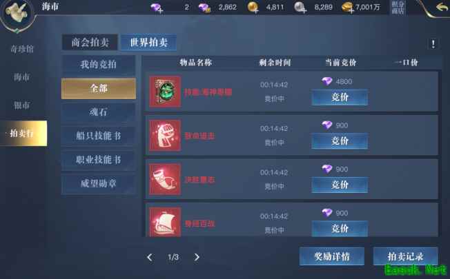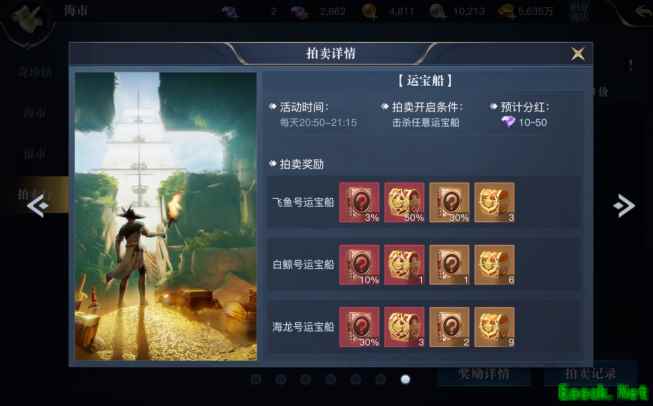 7.运宝船 活动时间:每日20:50-21:15 拍卖开启条件:商会击杀任意运宝船 拍卖奖励:传说职业技能、传奇船只技能、史诗职业技能、史诗船只技能 预计分红:10~50绑钻