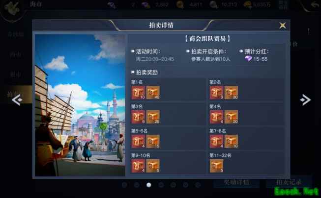 3.商会组队贸易 活动时间:周二20:00-20:45 拍卖开启条件:参赛人数达到10人 拍卖奖励:传奇魂石自选箱、史诗魂石自选箱 预计分红:15~55绑钻