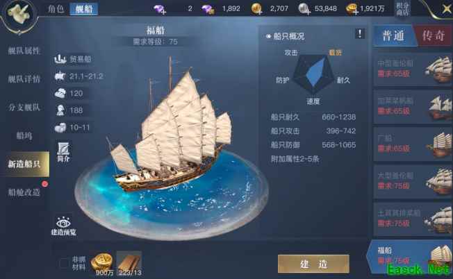 2.舰队货舱加成 分舰队船只的货舱数量也会影响分舰队的收益,船只货舱数越多,收益加成越高。我们可以通过建造更高等级的贸易船来获得更多的舰队货舱,从而提升分舰队收益。例如,5级的柯克帆船仅有3个货舱,而75级的福船最高可拥有11个货舱。点击“一键上阵”时将会自动选取主舰队和船坞中货舱最多的船只上阵。