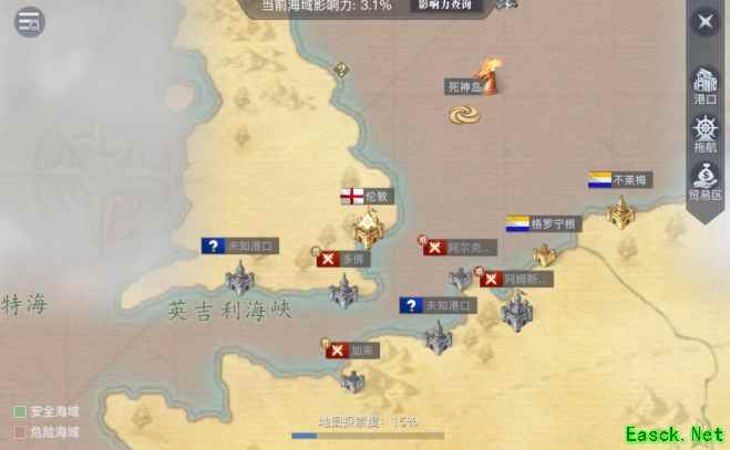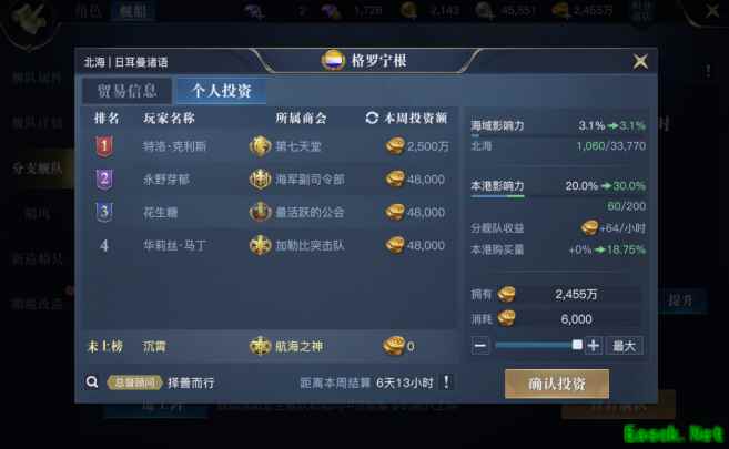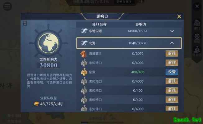 (2)投资港口 难度系数:★☆☆☆☆ 推荐指数:★★★★☆ 投资港口同样是我们提升海域影响力的一条捷径,所有登陆并解锁的港口均可进行投资。虽然投资港口不需花费精力,但却需要消耗大量贸易币,我们可以在根据自己的贸易币数量来酌情进行投资。港口投资占据了世界影响力的绝大部分,推荐大家在贸易币足够的情况下大量进行投资,从而得到更高的分舰队收益。