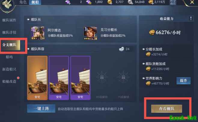 2.收益获取入口 我们可以在游戏界面的右下角进入“船只”界面后,选择“分支舰队”一栏,在界面右下角“查看舰队”选项处查看并领取分舰队收益。