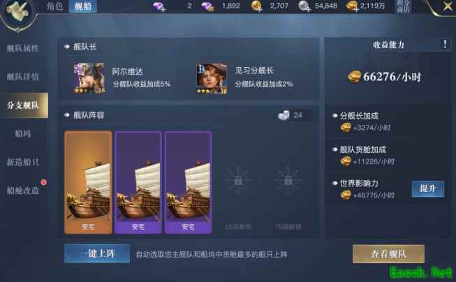 3.世界影响力加成 提升世界影响力也可以增加分舰队的挂机收益。在游戏中,我们可以通过登陆新港口、击败海域霸主及投资港口三种方式来提升自己的世界影响力。