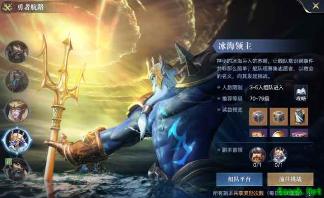 4.冰海领主 冰海领主的推荐挑战等级为70~79级,击杀首领有几率获得:绿色品质船甲、绿色品质船炮、蓝色品质船甲、蓝色品质船炮、紫色品质船甲、紫色品质船炮、橙色品质船甲、橙色品质船炮、70级绿色品质装备、70级蓝色品质装备、70级紫色品质装备、70级橙色品质装备、特级装备设计图、70级装备币及卓越魂石。