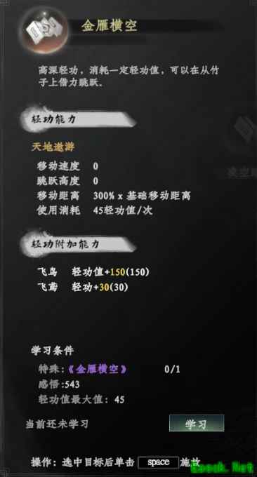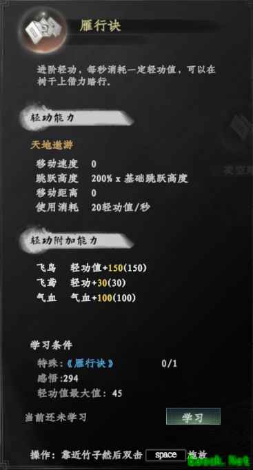 轻功介绍:每秒持续消耗一定轻功值,可以在竹子上借力踏行 习得方法:主线任务进行至一定阶段后可习得 学习条件:雁行诀秘籍*1,感悟294,轻功值最大值45 使用方法:靠近竹子后双击space(空格)键 PS:学会雁行诀才能去学习金雁横空,获得在竹子上借力跳跃的能力 金雁横空