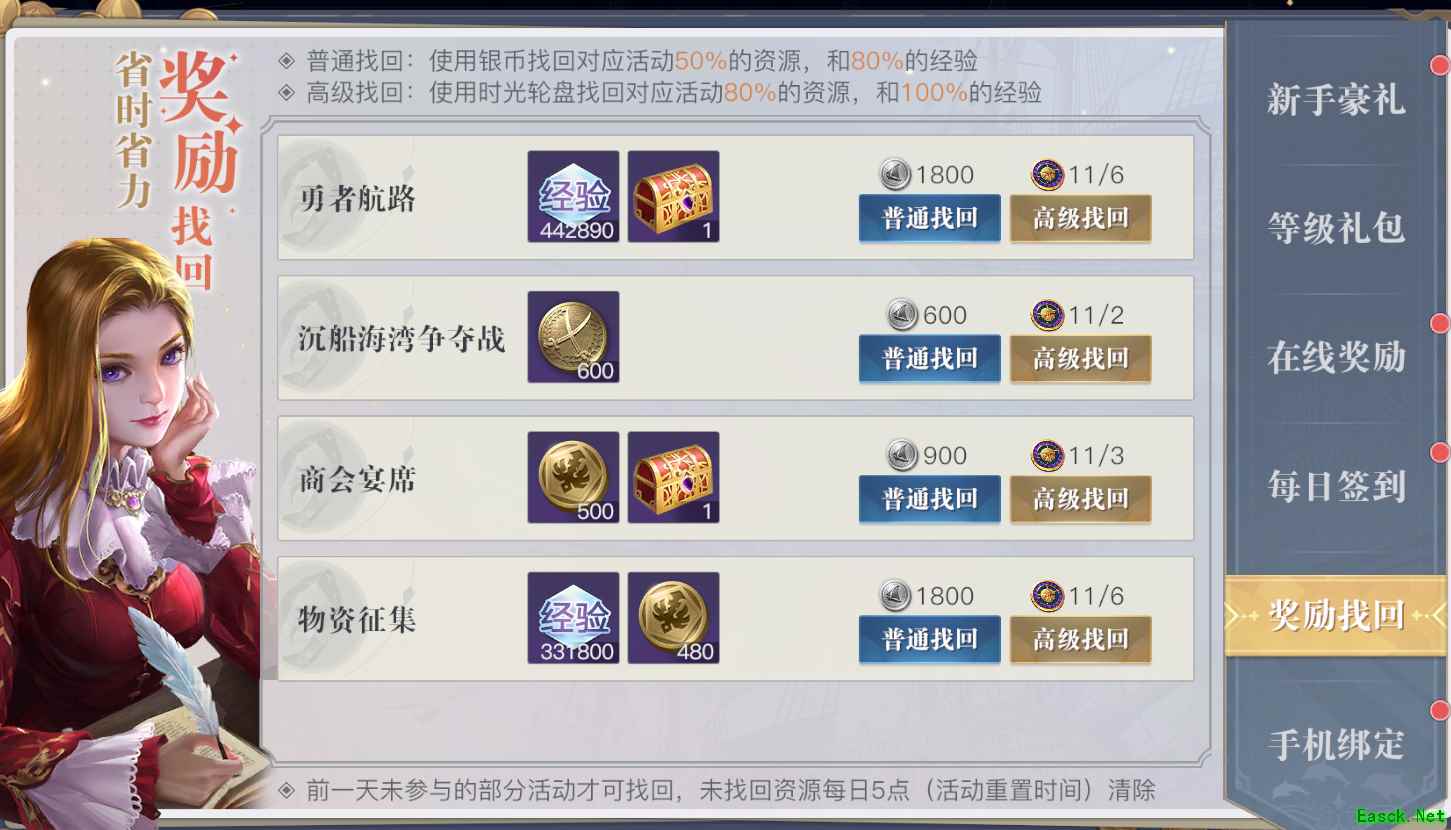 奖励找回的方式分为普通找回和高级找回。 普通找回:使用银币,找回对应活动50%的资源和80%的经验。 高级找回:使用时光轮盘(商城5个钻石购买,土豪玩家无脑冲!),找回对应活80%资源和100%的经验值。 推荐直接高级找回,特别是“勇者航路“的活动本身副本难度大需要队友配合不好打,所以打不过直接第二天领个高级找回,拿到100%的经验值,可以说是不用打也能获得奖励,岂不美哉。