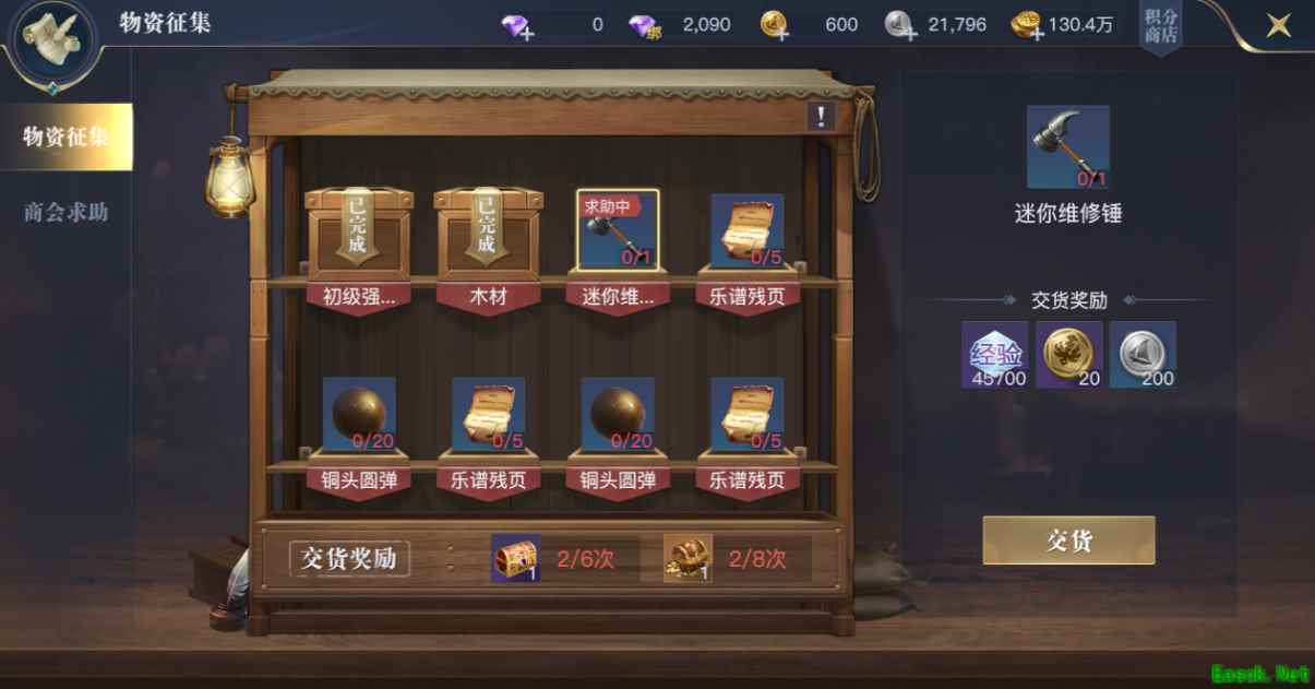 获得奖励除经验值外,还有随机装备、装备设计图、装备碎片(可兑换装备)、初级强化源石、初级突破石(强化突破船装)、25活跃度的奖励,每日只需完成一次即可获得全部奖励,是升级每日必打副本。 四、可选做任务 除了以上每天必做任务外,还有“物资征集”、“勇者航路”可选做,如果我们的实力与能力无法达到完成任务的要求,不建议强行完成。但如果可以抱到商会和大佬大腿,那就可以美滋滋的完成了。 1、“物资征集” 开启等级:46级 奖励次数:8次 推荐指数:★★★☆☆ 单人任务,需加入商会 物资匮乏、无法集齐道具的玩家不建议强做 任务是向自己的商会上交所需的货物以此获取经验,每天上线只需动动自己的“金手指”,点一点上交就能获得经验值。交货6次就可以开启普通宝箱(商会贡献度和铁块),全部完成8次开启完美宝箱(商会贡献度、紫色魂石、希望之花碎片)并且获得16活跃度。