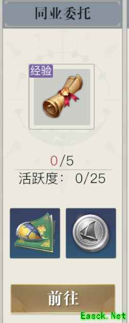 三、必做的经验类活动任务 1、“同业委托” 开启等级:10级 可做次数:5次 参与推荐:★★★★★ 全程挂机开自动即可完成的小任务,每日可获取五次任务奖励,可获取大量经验,推荐每天必做! 点击前往后会自动引导前往塞维利亚的NPC约翰·法雷尔处领取委托。如果距离较远会显示是否“拖航”,拖航后可直接到达塞维利亚。需注意的是如果船上有货物建议卖出后再拖航,否则货物将直接按成本价返还交易所了,推荐大家闲暇时前往做任务。