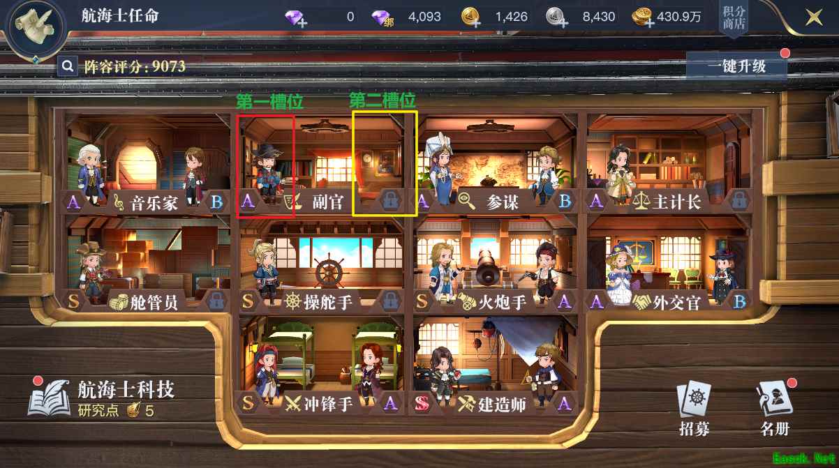 2、解锁职位槽 值得一提的是,战团加成SS、S航海士不计算:副舰长、分舰长职位的航海士,只计算航海士任命界面内的航海士,所以我们要尽量解锁航海士职位槽,任命更多航海士。 每个职位默认会开启一个槽位,需要对应的职位证才能开启第二槽位。