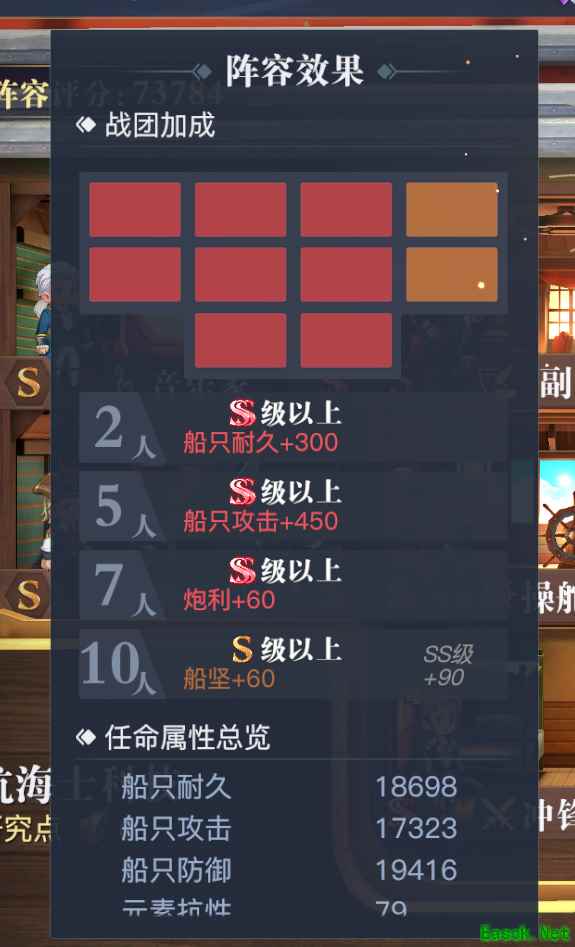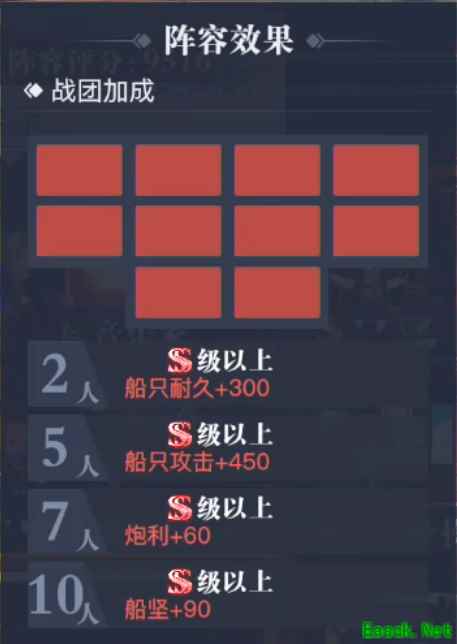 战团加成仅计算最高品阶,例如:触发2位SS航海士战团加成后,将覆盖2位S航海士战团加成效果,而2人、5人、7人、10人战团加成则可以同时享受。建议在恰好能触发10人S级战团加成时,需根据新SS航海士收益情况考虑是否解除战团加成。