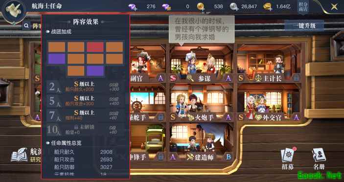 2位S航海士 船只耐久+200 5位S航海士 船只攻击+300 7位S航海士 炮利+40 10位S航海士 船坚+60 2位SS航海士 船只耐久+300 5位SS航海士 船只攻击+450 7位SS航海士 炮利+60 10位SS航海士 船坚+90