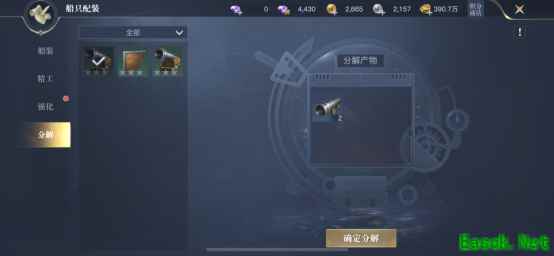 最后是分解,我们多余的船装要怎么使用呢?可以放到分解这里,将其变成同类船装精工的部件,用来精工需要加强的船装。这里一定要注意,只分解多余出来的船装,一定不要为了追求某件船装的极致属性,而将装备的船装卸下拿去分解,这样可就得不偿失了。