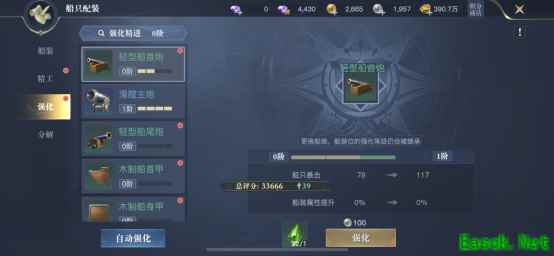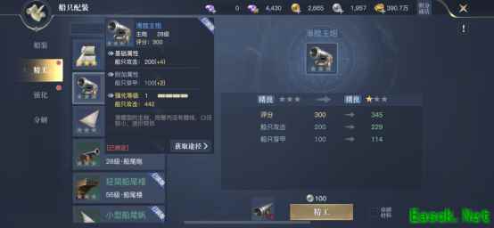 接下来是强化,船只强化是提升船装的属性,需要注意,同一部位的船装再更换时自动继承强化等级和属性,这样一来就不会造成我们替换船装时,造成材料浪费的情况了。我们在强化船装时需要消耗银币和强化源石,在到达一定强化次数后,需要进行突破,这时会消耗突破石。需要注意,我们将一定数量的船装强化至指定阶段时,还可以激活精进效果,增加更多额外属性。因此初级的强化,我们可以雨露均沾,将全部船装提升至对应等级,这样增加的属性会比单独强化某一个要高很多。在中后期,再根据角色的特性,侧重去提升所需要的属性即可。
