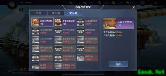 【船舱改造玩法】 我们在建造船只以后,需要在船舱进行改造,这里的改造可以分为战斗和贸易两种舰队。战斗舰队的船舱改造可以增加各项战斗性能,比如高级火炮舱,可以增加船只高额攻击力;像医疗室则是增加船只受到的治疗效果属性加成,根据职业的需求,我们可以自由搭配。贸易舱可以增加交易属性,比如兵器工艺货舱,可以增加工艺品和兵器类物品的利润;而食品烟草舱则增加食品类和嗜好品类的利润,通过这些属性加成,贸易能力可以大幅度提升。
