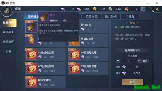 铁块是造船刚需,建议后期玩家攒的钻,这个限购每周买到上限。另外建议,玩家以造战斗船为主,并且在55级或65级后才开始怼S级,之前等级太低,造出很快就淘汰看。至于贸易船保证等级不落后的情况下,做到A级就够用了。 2、船只技能