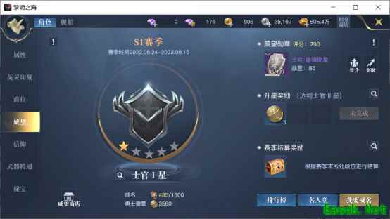 与爵位有些类似的玩法,但没有爵位那么复杂。威望玩法是赛季制的,等级越高,赛末的奖励也越高。 而玩家主要通过每周三、周四的商会联赛,获得威望与星魂,来晋升或突破自己的勋章,甚至获得更高级的勋章,潜力非常高。