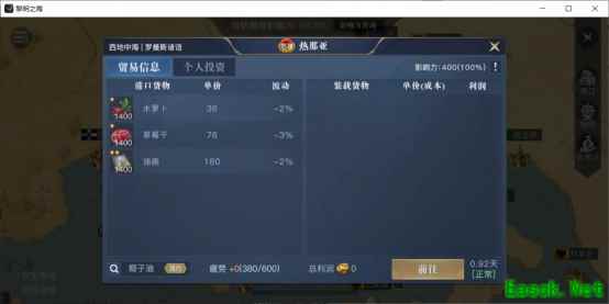 2、港口投资(高星商品解锁) 港口投资是解锁高星商品的唯一途径。但这个投资虽然说是投资,但其实是没有回报的,也就是纯消耗贸易币。 因此,建议前期在保证本钱的情况下,港口投资选择4~5个就行了,能单靠贩卖高星商品消耗一天的疲劳就差不多了。 后期,由于投资玩法的重要性,每一个港口基本投资都会点满的。