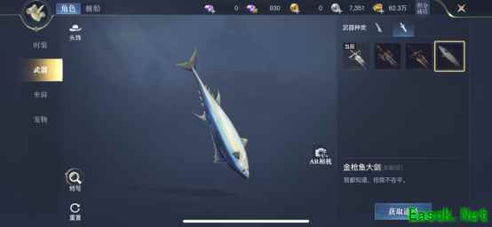 武器的装饰可谓是非常有趣,不同类型的武器都有独特的时装外观,比如双手剑系列,就有比较霸气的杜兰德尔之剑,具有趣味性的则是金枪鱼大剑。一条巨大的蓝鳍金枪鱼,这要是拿去卖了,可是一笔不菲的收入。至于武器的装饰的获取方法,可以通过商城或者钓鱼商店购买。