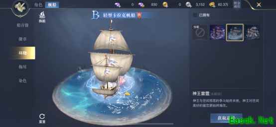 【舰船装饰,建造独一无二的战舰】 舰船的装饰品也是一绝,游戏里从船首到船尾,哪怕是舰船整体的配色,都可以进行修改。比如船首像,可以搭配独角兽、人鱼少女像等装饰;船帆上可以添加各类徽章,有些类似于海贼的标志,谁能拒绝一个萌萌的鲨鱼船帆呢?船体周围的环绕可以选神王雷霆,四周雷电环绕,先不说战斗力如何,看着就很有压迫感。