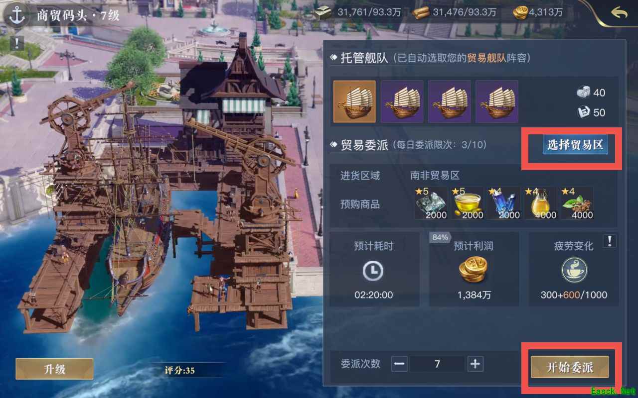 (3)贸易委派 难度系数:★☆☆☆☆ 推荐指数:★★★☆☆ 每日贸易委派的次数会随着商贸码头的等级提升而不断增加,贸易收入同样会随着托管舰队的属性及商贸码头等级不断提升。虽然贸易委托不需要我们手动操作,可以在后台挂机完成,但是收益较低。建议肝帝玩家们每日依靠自由贸易耗尽疲劳值上限,不要进行贸易委派。