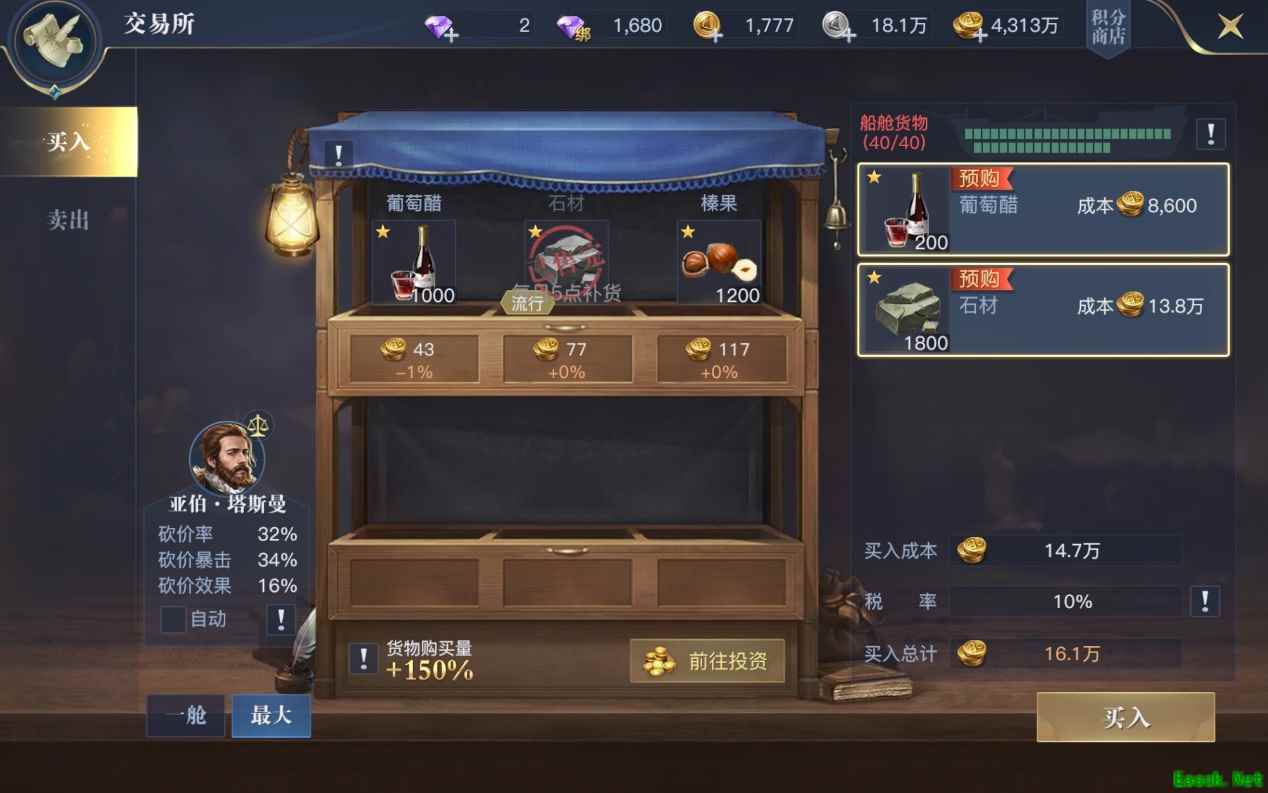 (2)自由贸易 难度系数:★★☆☆☆ 推荐指数:★★★★★ 我们每天都可以进行多次海上贸易并获得大量贸易币。其中出售流行商品能获得极高利润,且不增加疲劳度;普通商品会根据商品等级增加不同的疲劳度。疲劳度到达上限后,我们将无法出售商品。建议肝帝玩家每日优先进行流行商品贸易,随后再进行普通商品贸易,尽量将疲劳值用至上限。