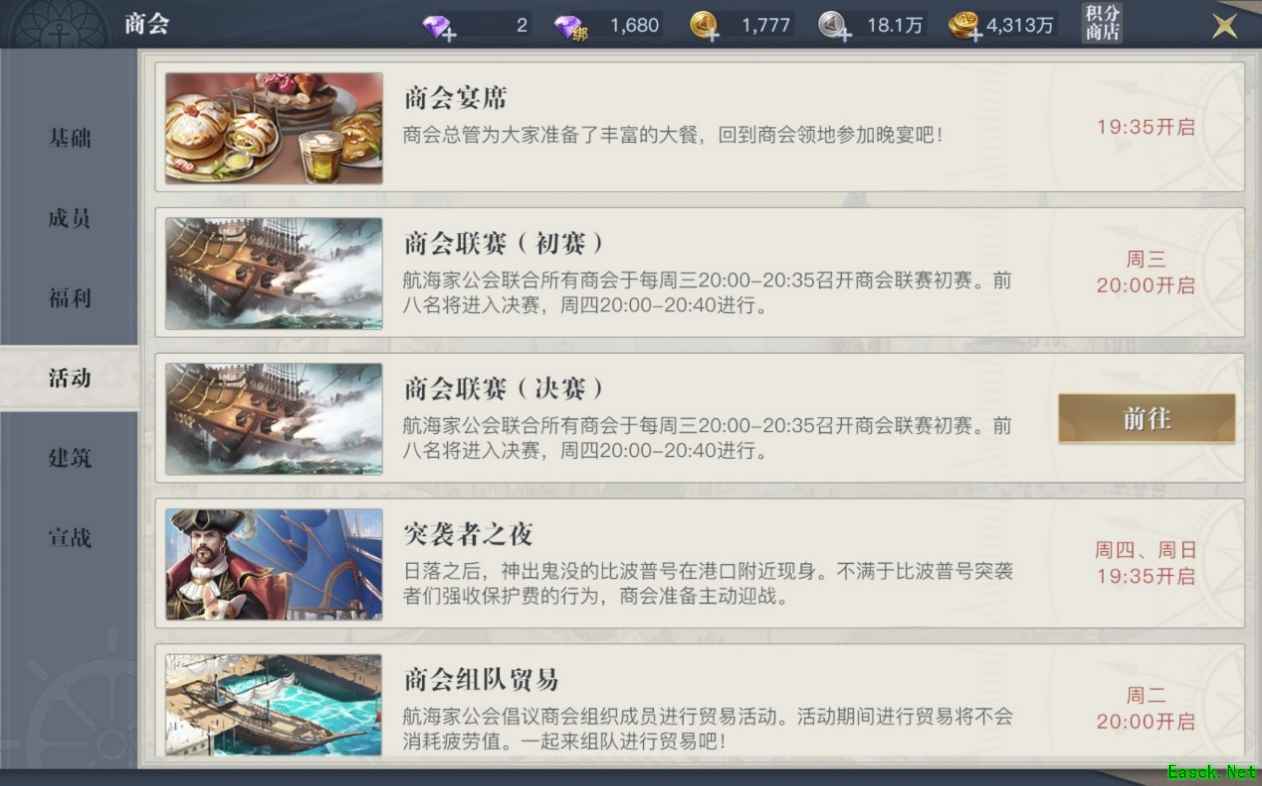 3.限时活动 《黎明之海》游戏每周都会开启各种限时活动,这些活动大部分门槛较低且奖励丰厚。对于肝帝玩家来说,建议大家全部完成,玩法推荐如下: (1)商会活动 难度系数:★★☆☆☆ 推荐指数:★★★★★ 商会每日都会开启大量活动,如运宝船、皇家竞答和商会答题。周一、周二、周三、周四及周末还有额外开启商会宴席、商会组队贸易、商会联赛、突袭者之夜及商会投资战活动。 参与活动后可以获得银币、商会贡献度、勇士徽章、船只技能、命运石碎片、战斗图纸等丰厚奖励,若是商会在活动中取得了名次,还可以额外赢取拍卖奖励并获得绑钻分红。 建议肝帝玩家们尽可能参与全部商会活动,即便没有成功,也可以获得奖励。