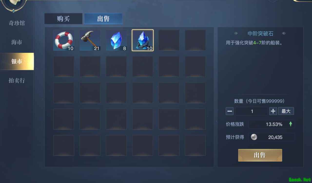 5.交易行 《黎明之海》中共有三个交易行,分别为奇珍馆、海市与银市。只有非绑定的物品才可以在奇珍馆与海市中上架并进行售卖,银市则无所限制。 奇珍馆使用钻石进行交易,可以上架的物品均为橙色及以上品质;海市使用金币进行交易,可以上架的物品均为紫色及以上品质;银市使用银币进行交易,可以出售稀有材料。 推荐肝帝将副本中奖励的非本职业装备、魂石、稀有材料,或是建造出的多余装备、不绑定船只全部上架交易行,以此赚取大量货币。