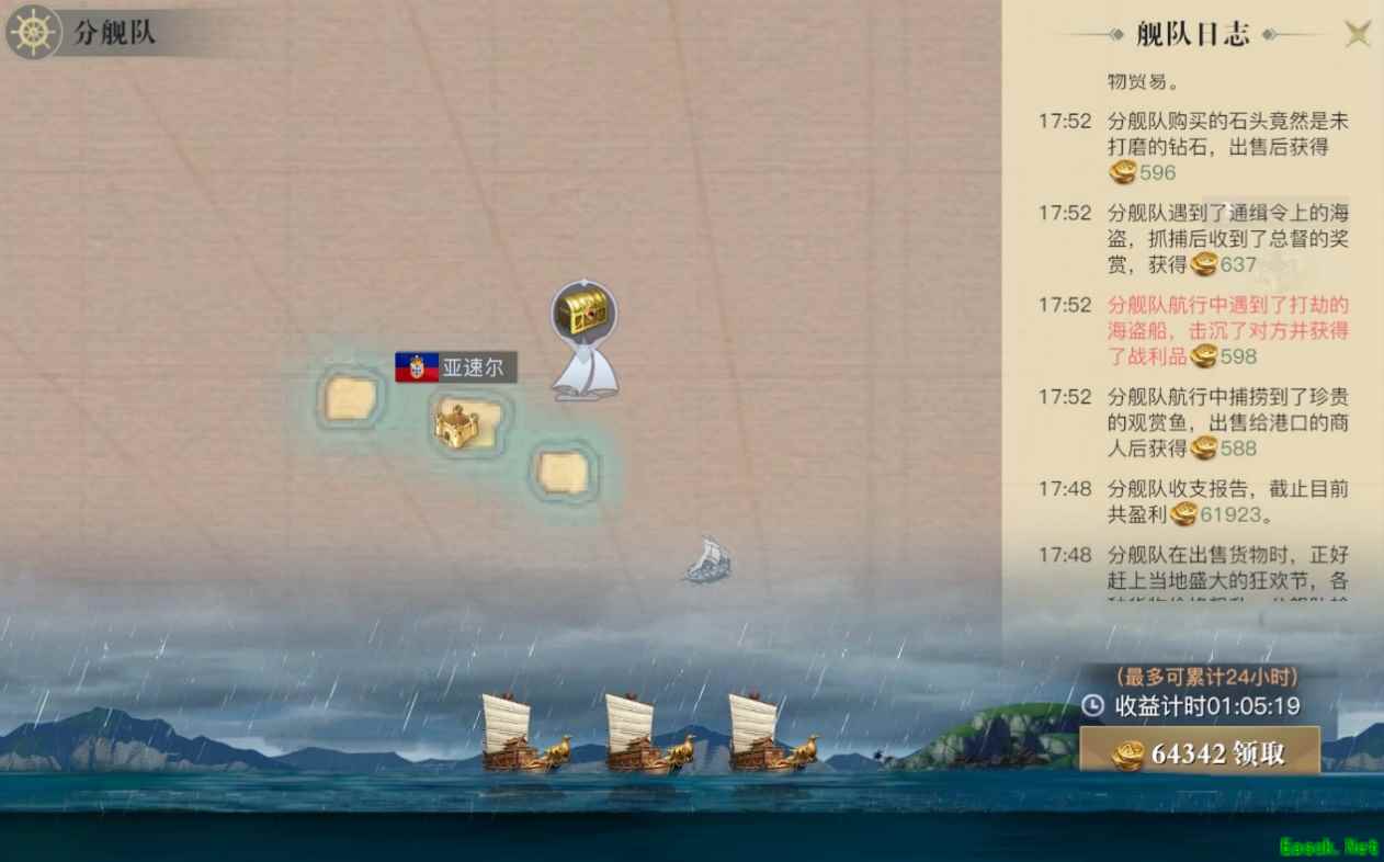4.自由贸易 我们每天都可以进行多次海上贸易并获得大量贸易币。其中出售流行商品能获得极高利润,且不增加疲劳度;普通商品会根据商品等级增加不同的疲劳度。疲劳度到达上限后,我们将无法出售商品。对于肝帝玩家,自由贸易的建议如下: (1)分支舰队 难度系数:★☆☆☆☆ 推荐指数:★★★★★ 启航后的分舰队处于自动贸易状态,每半小时汇报一次收益结算,最多可积累24小时的挂机收益,超过24小时后的挂机收益将不再计入,建议肝帝玩家玩家每天及时领取贸易,刷新分舰队出海。