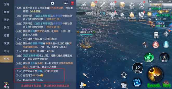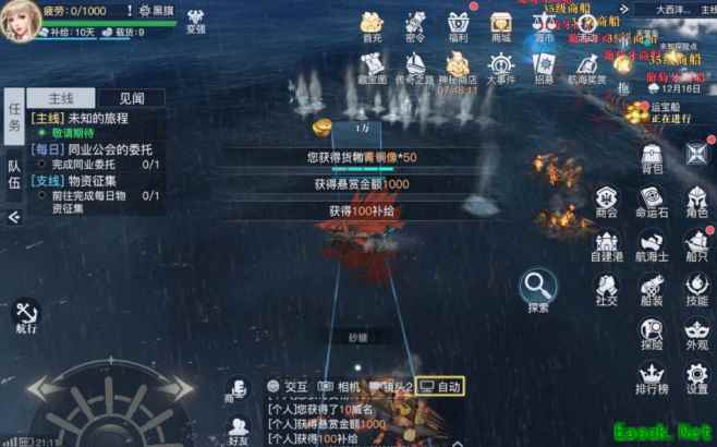 三、悬赏玩法 在黑旗模式下,我们击杀冒险家或是击沉商船,都将被挂上悬赏。同样,我们可以通过击杀其他罪犯冒险家来获得他所有的悬赏金额,每日可以通过黑旗玩法得到的贸易币上限为100万。 建议大家优先进行黑旗贸易来获取贸易币,若是在危险海域内遇到了战力比自己低的罪犯冒险家,也不要忘记上前拿取悬赏。