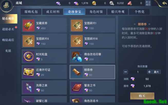 我们可以通过缴纳赎罪券来减免监禁时间,赎罪券可以在钻石商店中花费50绑钻购买,每张赎罪券可以消除20分钟的入狱时间,最多可消除至剩余5分钟。