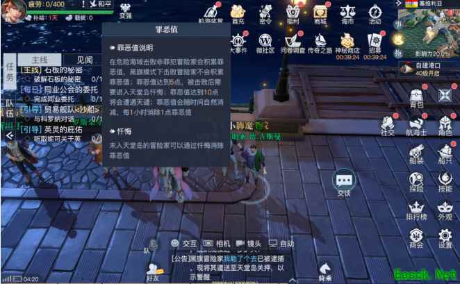 2.罪恶值简介 在危险海域击败非罪犯冒险家会积累罪恶值,击败黑旗模式冒险家不会积累罪恶值。罪恶值达到5点,被击败后需要进入天堂岛忏悔;罪恶值达到上限10点将会遭遇天谴。 罪恶值会随着时间自然消失,每1小时将消除1点罪恶值。尚未被抓入天堂岛的冒险家可以通过在钻石商城购买洗罪之泉来进行忏悔,并消除自己的罪恶值。每瓶洗罪之泉的价格为50绑钻,1瓶洗罪之泉可以降低1点罪恶值。