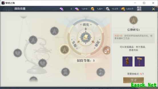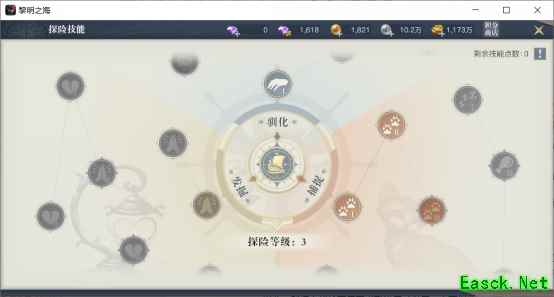 二、探险玩法、收益 1、探险技能 当玩家通过不同探险玩法收集的研究点数,从而提升探险等级后,就会获得技能点,学习探险技能。 探险技能是单纯的生活技能,不能增加玩家的战斗力,主要分为坐骑驯化、宠物驯化、信仰研究三个方向。