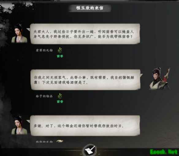 《下一站江湖2》程玉欣不死攻略:玩家在接到任天游告诉你让你送东西给程玉欣之前,程玉欣会先给玩家发一条飞鸽,如图1所示,如果玩家把她要的东西给她,那在接到任天游任务后她就不会死,会在图2红圈这里等玩家交任务,然后玩家回云鹤村的路上也会触发任天游和熊的剧情。