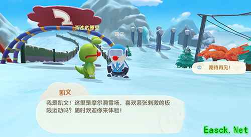 NPC名字叫凯文,对话完毕之后他会送你滑雪板。这个只是基础滑雪板,后期应该会有更好看的滑雪板。