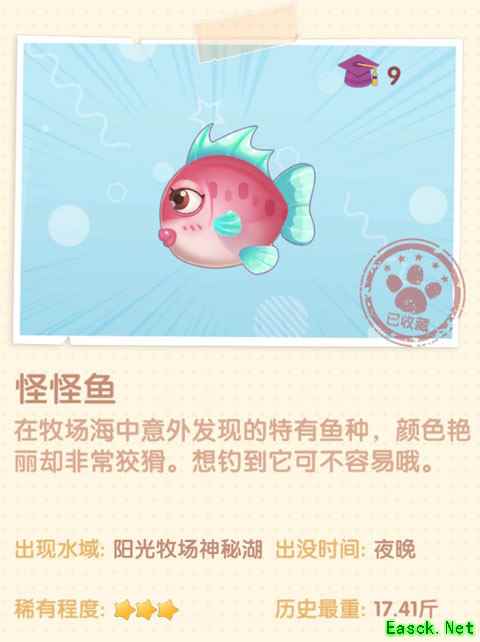 《摩尔庄园手游》怪怪鱼图鉴一览生物介绍 在牧场海中意外发现的特有鱼种,颜色艳丽却非常狡猾。想钓到它可不容易哦。 出现水域 阳光牧场神秘湖 出没时间 夜晚 历史最重 17.41斤