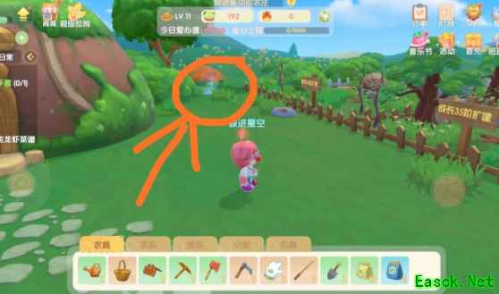 如图所示,在小屋的右边,图上有标记的地方 木材可以通过家园、任务和种子店获取,家园里自己砍出来的,在家园可以砍树砸石块 所有不必要的花销(比如抓娃娃机)第一周不建议搞,小镇捐赠用木头石头草充数就好。