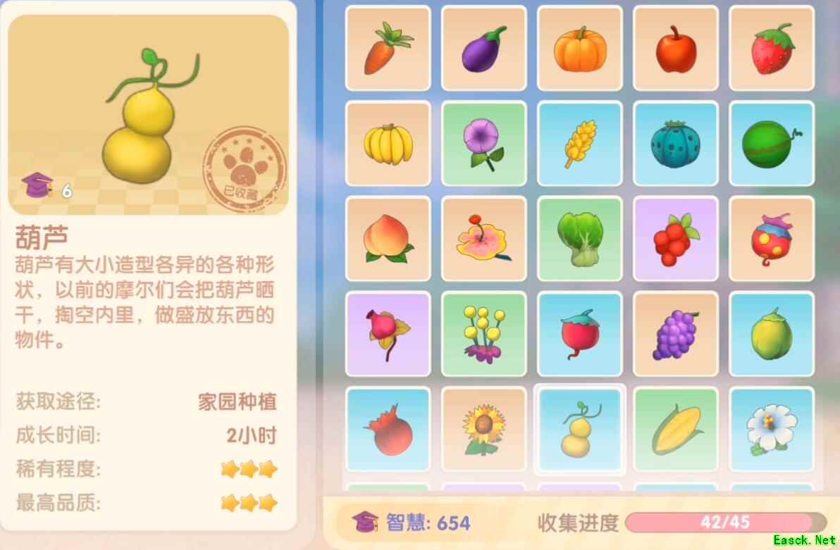 种子成本:17 花婶售价:31 采摘所需爱心:16 葫芦描述: 葫芦有大小造型各异的各种形状,以前的摩尔们会把葫芦晒干,掏空内里,做盛放东西的物件。