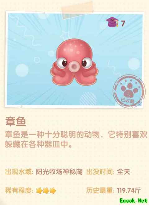 《摩尔庄园手游》章鱼图鉴一览生物介绍 章鱼是一种十分聪明的动物,它特别喜欢躲藏在各种器皿中。 出现水域 阳光牧场神秘湖 出没时间 全天 历史最重 119.74斤