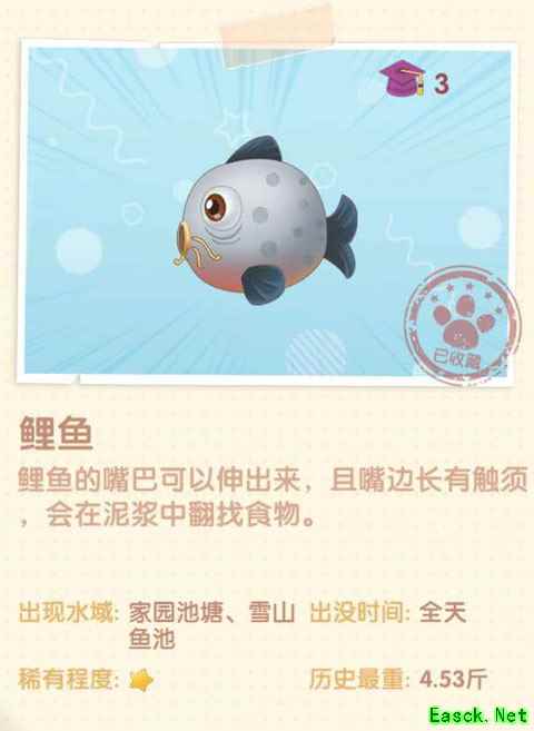 《摩尔庄园手游》鲤鱼图鉴一览生物介绍 鲤鱼的嘴巴可以伸出来,且嘴边长有触须,会在泥浆中翻找食物。 出现水域 家园池塘、雪山鱼池 出没时间 全天 历史最重 4.53斤