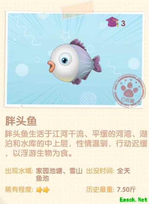 《摩尔庄园手游》胖头鱼图鉴一览生物介绍 胖头鱼生活于江河干流、平缓的河湾、湖泊和水库的中上层,性情温驯,行动迟缓以浮游生物为食。 出现水域 家园池塘、雪山鱼池 出没时间 全天 历史最重 7.50斤
