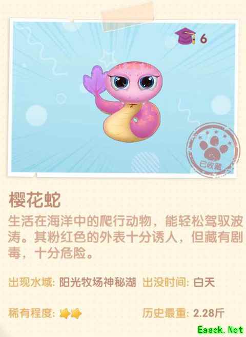 《摩尔庄园手游》樱花蛇图鉴一览出现水域 阳光牧场神秘湖 出没时间 白天 历史最重 2.28斤
