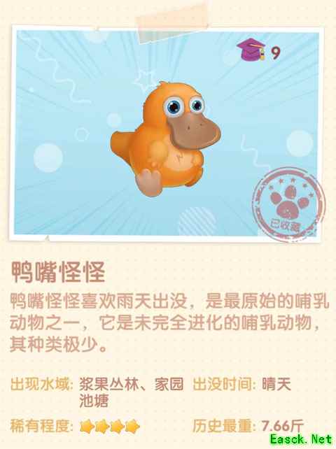 《摩尔庄园手游》鸭嘴怪怪图鉴一览出现水域 浆果丛林、家园池塘 出没时间 晴天 历史最重 7.66斤