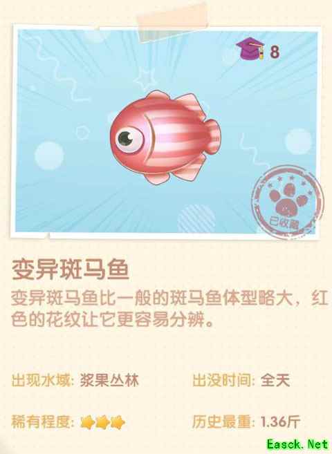 《摩尔庄园手游》变异斑马鱼图鉴一览出现水域 浆果丛林 出没时间 全天 历史最重 1.36斤