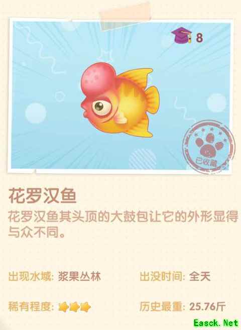 《摩尔庄园手游》花罗汉鱼图鉴一览出现水域 浆果丛林 出没时间 全天 历史最重 25.76斤