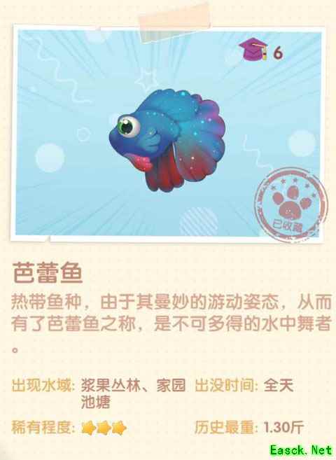 《摩尔庄园手游》芭蕾鱼图鉴一览出现水域 家园池塘、浆果丛林 出没时间 全天 历史最重 1.3斤